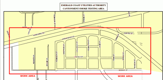 The smoke testing in Cantonment started Monday morning on the eastern side of the area depicted on the map and will work towards the west. Monday’s testing included the Ransom and Griggs street areas.