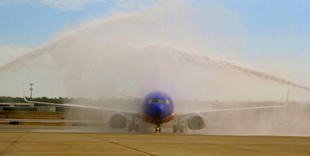 Pictured top: Southwest Airline’s first weekday flight arrives at Pensacola International Airport Monday. Pictures inset: Southwest’s terminal inside the airport. Pictured below: Water cannons welcome the flight to Pensacola. Courtesy photos for NorthEscambia.com, click to enlarge.