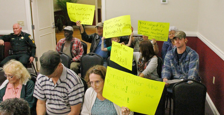 Pictured top: A small group of protestors hold signs against a proposed barnyard animal ordinance during a Century Town Council meeting last Monday night. NorthEscambia.com photo, click to enlarge.