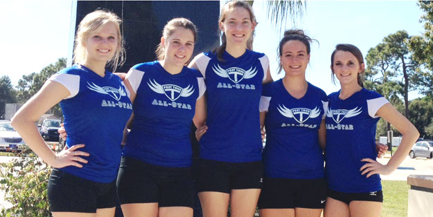 Five Northview High School seniors were named to the Florida Class 1A All-Star Volleyball team. They had the chance to play this weekend in St. Petersburg in front of college coaches for the opportunity to gain scholarships.. They were (picture, L-R) Lily Townson, Lana Clayton, Danielle Steadham, Rebecca Grim and Tiffani Pritchett. The five players also recently played as members of the 2013 Subway All-Star High School Volleyball West team in Pensacola. Submitted photo for NorthEscambia.com, click to enlarge.