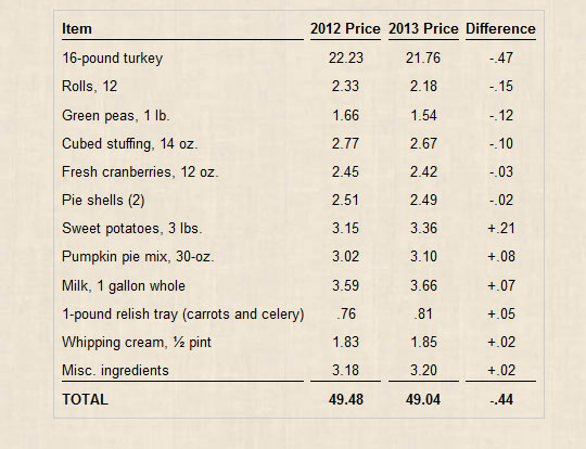 The big ticket item—a 16-pound turkey—came in at $21.76 this year. That was roughly $1.36 per pound, a decrease of about 3 cents per pound, or a total of 47 cents per whole turkey, compared to 2012. The whole bird was the biggest contributor to the final total, showing the largest price decrease compared to last year.