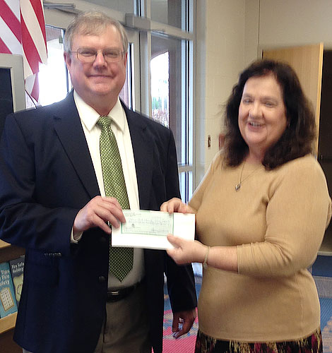 Pictured top and bottom: These photos show empty spots were computers were stolen from Molino Park Elementary School. Pictured inset: Aldersgate United Methodist Church Rev. Alan Gantzhorn presents a check to Molino Park Elementary School Principal Alice Woodward Thursday. Submitted and NorthEscambia.com photos, click to enlarge.