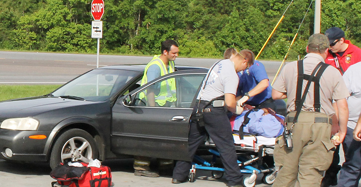 Pictured: Fire responders remove a driver from their vehicle following a minor crash at the Highway 29, Highway 97 intersection in Molino earlier this year. NorthEscambia.com photo, click to enlarg.