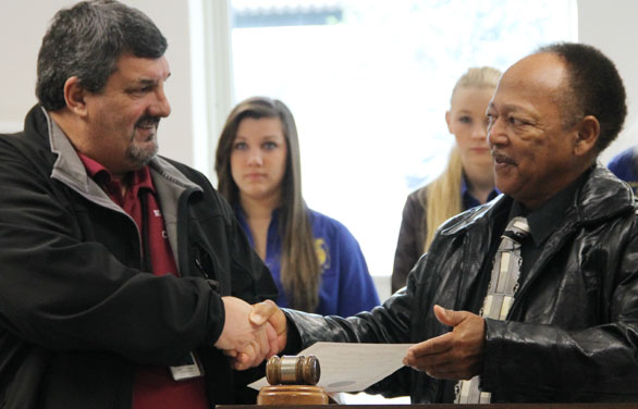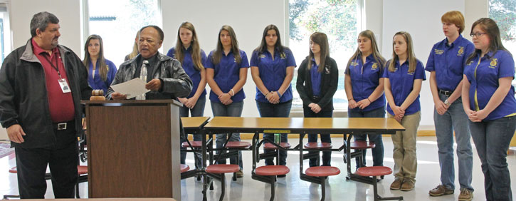 Pictured top: Century council member Gary Riley (at podium) presents a Town of Century Proclamation on behalf of Mayor Freddie McCall to Northview Assistant Principal Gerry Pippins as the NHS FFA officer team looks on. Pictured inset: Pippins accepts the proclamation Friday morning from Riley. Pictured below: On behalf of the Northview FFA, President Courtney Solari (left) and Secretary Bethany Reynolds (middle) receive the Three Star Chapter award on live national television during the National FFA Convention in Louisville, KY, in October. NorthEscambia.com photos, click to enlarge.