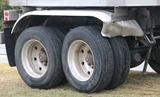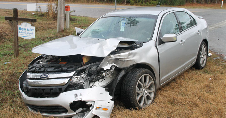 Pictured top and below: Two people in this Ford Fusion were injured when they reportedly pulled out from a stop sign and underneath an 18-wheeler trailer Wednesday afternoon. Pictured inset: A fender and tire on the truck trailer hit the car. NorthEscambia.com photos, click to enlarge.
