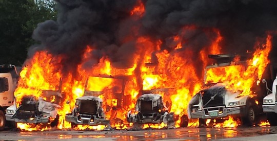 Multiple dump trucks were destroyed by fire at Roads, Inc. on Stone Boulevard in Cantonment.