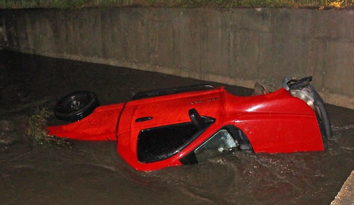 A pickup truck plummeted into a rain-swollen creek in Bratt. The driver escaped without injuries.