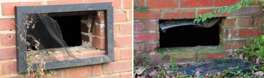Pictured top: Thieves apparently accessed the crawlspace under the Molino Community Complex using small ventilation openings on the front (pictured left) and back (right) of the building. Pictured inset: A sign on an HVAC unit warns of an alarm system. Pictured below: The HVAC units at the county owned building were also protected by fencing and cages around each unit. NorthEscambia.com photos, click to enlarge.