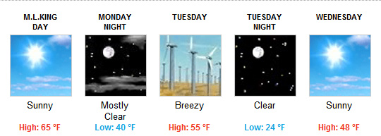- Wednesday: Sunny, with a high near 48. North wind around 5 mph becoming southwest in the afternoon.