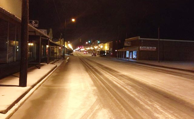 Here’s a look at a frozen downtown in Flomaton (above) and Atmore (below) Tuesday night. Reader submitted photo for NorthEscambia.com, click to enlarge.