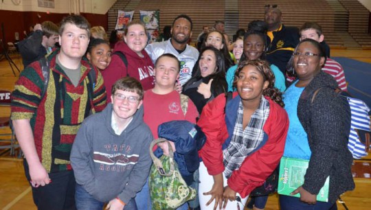 Leigh Torrence, retired player for the Jacksonville Jaguars and the Super Bowl champ New Orleans Saints, spoke about his life and career, focusing on the importance of good nutrition, eating breakfast and exercising. Before participating in a question and answer session with students, Torrence led the gym full of Tate students in exercise activities.