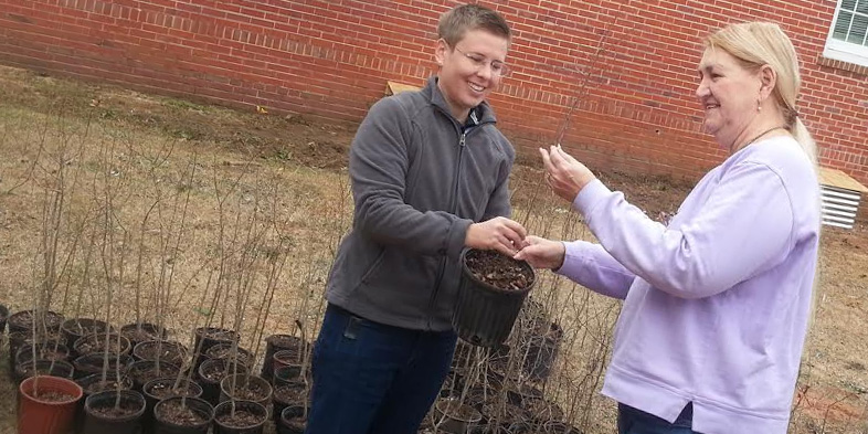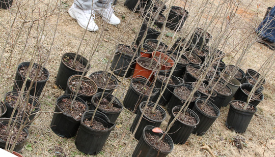 Pictured top and below: Free trees during an Arbor Day celebration in Molino Friday morning . Pictured inset: Extension Agent Libbie Johnson explains proper tree planting. NorthEscambia.com photos, click to enlarge