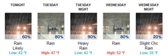 - Tuesday Night: Rain. The rain could be heavy at times. Low around 42. North wind 5 to 10 mph. Chance of precipitation is 90%.