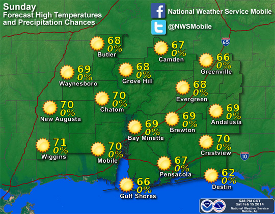 - Sunday: Sunny, with a high near 69. Calm wind becoming southwest around 5 mph in the afternoon.