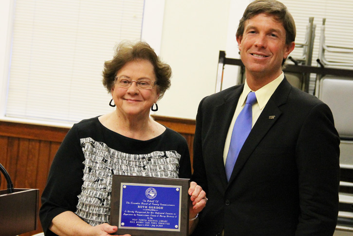 Also at Monday’s town hall meeting at the Barrineau Park Community Center, Barry presented plaque to Ruth Gordon. She worked to have an unused classroom building at the Molino Community Complex re-purposed for Head Start, which will relocate there next school year from Cantonment. She also served as the District 5 member on the West Florida Regional Library Blue Ribbon Task Force Committee.