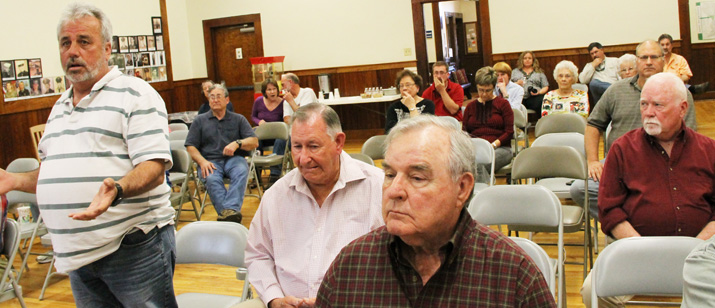 Pictured top: Escambia County District 5 Commissioner Steven Barry addresses a town hall meeting Monday evening at the Barrineau Park Community Center. Pictured top inset: Escambia County Public Works Director Wes Moreno discusses dirt road paving. Pictured bottom inset: Barry presents an appreciation plaque to Ruth Gordon who served on a library task force. Pictured below: Numerous residents attended the meeting. NorthEscambia.com photos, click to enlarge.