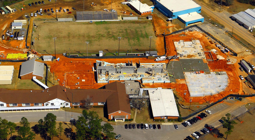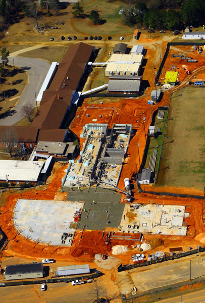 Pictured top and inset: Recent aerial photos of construction at Ernest Ward Middle School show the footprint of the new building, directly behind the current school. (courtesy FastAerial.com). Pictured below: Class construction. Pictured bottom: The foundation. Pictured bottom: Lunchroom foundation. NorthEscambia.com photos, click to enlarge.