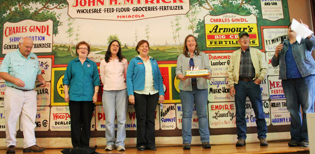 Pictured top: Escambia County Extension Agent Carrie Stevenson and 4-H caretaker Ellis Miller blow out the candles on 100th birthday cake for Escambia Extension. Pictured below: Extension employees sing “Happy Birthday” during the celebration Friday afternoon at the Barrineau Park Community Center. NorthEscambia.com photos, click to enlarge.