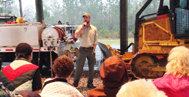 Tour participants were able to get out at their first stop, the Florida Forest Service in Molino to take a look at firefighting equipment. Other scheduled stops that were either skipped or where attendees stayed on their buses due to rain included a visit with the Matt Carter family of Bryneville, the 2013 Escambia County Farm Family; a look at modern corn planting on the McElhaney Farm on Dortch Road; a lesson in forestry from Kent Sherill of Sherill Timber at a location on Nokomis Road; and a look at precision agriculture at Walker Farms on North Highway 99.