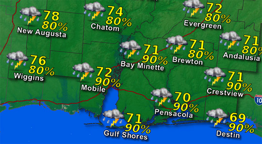 - Friday Showers and thunderstorms. High near 71. South wind 10 to 15 mph, with gusts as high as 20 mph. Chance of precipitation is 90%.