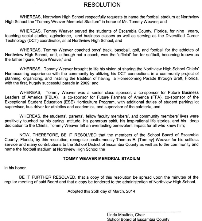 After an emotional outpouring from those that knew “Papa Weave” best, the Escambia County School Board voted Tuesday evening to name the stadium at Northview High School as the “Tommy Weaver Memorial Stadium”.