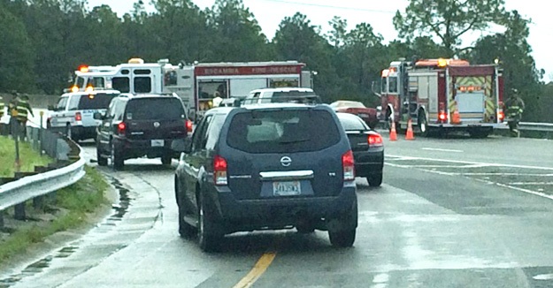 Pictured: Traffic was tied up at on the southbound Highway 29 entrance ramp to I-10 Sunday morning after crash the FHP said was caused by a Cantonment woman. NorthEscambia.com reader photo by April Pawless, click to enlarge.