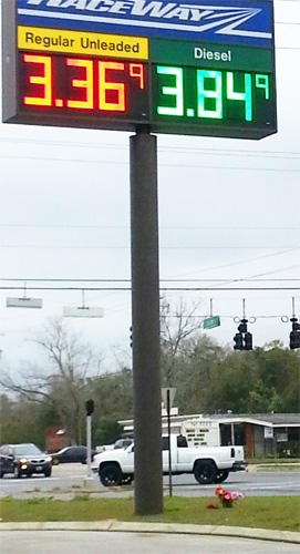 Pictured: A gas delivery in Century. Pictured inset: A gallon of regular unleaded was $3.36 Saturday in Cantonment. NorthEscambia.com photos, click to enlarge.