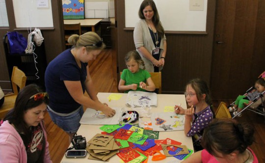 Pictured top: Library Administrator Darlene Howell presents a certificate of appreciation to Lil King and the Molino Mid County Historical Society for the groups efforts at the Molino Branch Library. Pictured inset: The Dogwood Dulcimers provided entertainment for the event. Pictured below: Children make library books bags during a craft activity. NorthEscambia.com photos, click to enlarge.
