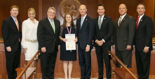Pictured top: Ag Commissioner Adam Putnam, Attorney General Pam Bondi, Senate President Don Gaetz, Jana Pavlus, Gov. Rick Scott, Pensacola Mayor Ashton Hayward, Rep. Mike Hill and CFO Jeff Atwater pose Tuesday in Tallahassee. Photo for NorthEscambia.com, click to enlarge.
