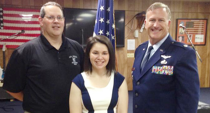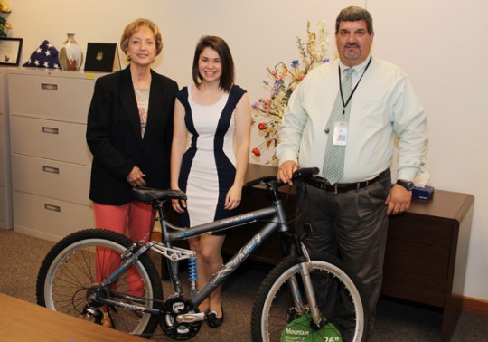 Pictured above are: Victoria Wright (center, seated), her parents Joseph and Tami Wright (seated): (back row, L-R) cousin Jessica McCullough, her grandparents John and Brenda Ekstrom and sister Elizabeth Wright. Pictured inset: Wright with her NJROTC instructors Charlie C. Code, Capt USN (ret), and Jeffrey D. Simpkins, CPO, USN (ret). Pictured below: Northview Principal Gayle Weaver and Assistant Principal Gerry Pippins presented Wright with a mountain bicycle to navigate between classes. NorthEscambia.com photos, click to enlarge. Pictured bottom: The Wrights with Lt. Col. David Landfair, USAFA’s admission liaison officer.