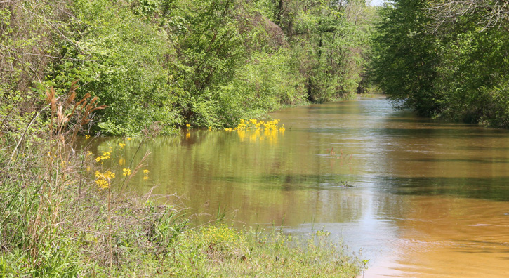 Pictured top: The Escambia River flooded the entrance road to Fischer Landing in Century Saturday afternoon. Pictured below: A wide view of the Escambia River as seen from Highway 4 Saturday afternoon. NorthEscambia.com photos, click to enlarge.