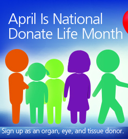 April is National Donate Life Month. Sign up as an organ, eye and tissue donor. Visit www.organdonor.gov.
