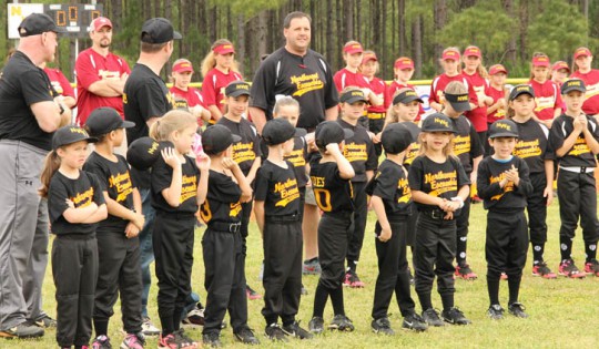 Pictured top and below: Opening Day ceremonies for Northwest Escambia and Bradberry Park in Walnut Hill. Pictured inset: Veteran and former judge Billy Ward tosses the first pitch. NorthEscambia.com photos, click to enlarge.