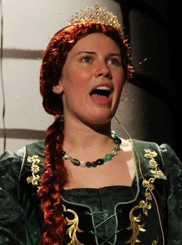 Pictured top: Donkey (Kendrick Walker) and Shrek (Cory Hester) make their plans to rescue a princess during Shrek the Musical Friday night at Northview High School. Pictured inset: Fiona (Anna Donald) counts the days that she’s been held in a castle tower. NorthEscambia.com photos, click to enlarge.