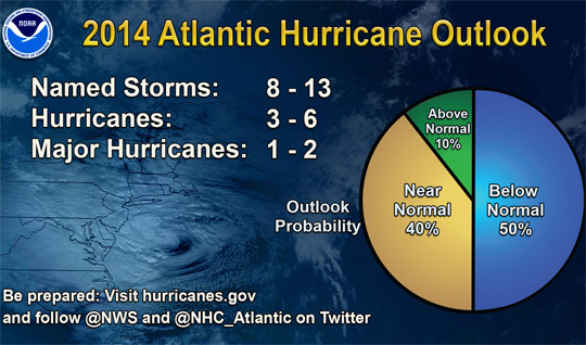 In its 2014 Atlantic hurricane season outlook issued today, NOAA’s Climate Prediction Center is forecasting a near-normal or below-normal season.