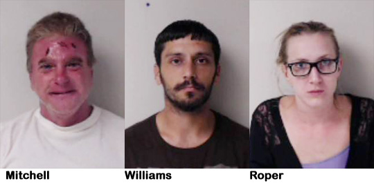 James Jonathan Mitchell, 50, was charged with battery, resisting an officer with violence, heroin trafficking and possession of drug paraphernalia. Phoebe Noelle Roper, 23, and Justin Wayne Williams were both charged with trafficking in opium/derivative and possession of narcotics equipments