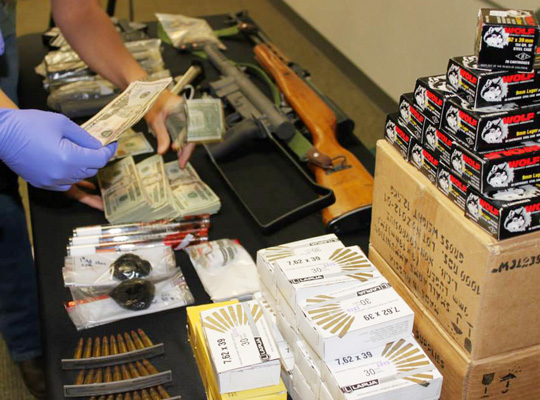 Multiple firearms were recovered including pistols, an assault rifle, a fully automatic submachine gun and a large store of ammunition, investigators said. A large sum of U.S. currency, vehicles, jewelry and other assets derived from the sale of narcotics was seized.