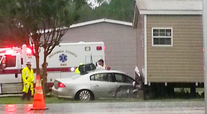 One person was injured when they crashed their car into and under a mobile home on a dealer’s lot late Wednesday afternoon just off Highway 29 in Cantonment. Their injuries were not considered serious. Further details, including the cause of the accident and the driver’s name, have not yet been released by the Florida Highway Patrol. Photos by Shane Carter (top) and Kristi Smith (inset and below) for NorthEscambia.com, click to enlarge.