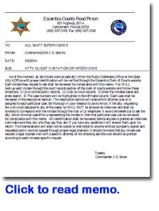 Attorneys complained they were denied access to inmates at the Escambia County Road Prison over the weekend due to a “secret” memo that ordered shift supervisors to only allow listed attorneys of record and those from the public defender’s or State Attorney’s office to see inmates, Ricksblog.biz reported Monday morning. The memo was written by Escambia Road Prison Commander C.S. Snow.