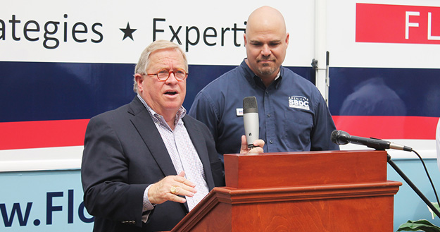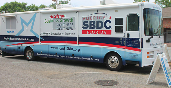 Pictured top: Greater Pensacola Chamber President Jerry Maygarden (left) and Kelly Massey, Regional Director for the Florida SBDC at the University of West Florida, discuss available assistance for local-area businesses affected by the recent severe storms. Pictured inset: The The Florida Small Business Development Center (FSBDC) at the University of West Florida’s Mobile Assistance Center (MAC). Photos for NorthEscambia.com, click to enlarge.