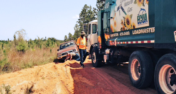 On Tuesday, I was driving on Lambert Bridge Road when I cam upon this scene — an ECUA sanitation truck stopped because an oncoming driver had slid his truck and trailer off the soft shoulder and into the ditch of the dirt road. ECUA employees Jamore Simmons and Reginald Evans attached a tow line and quickly had Mr. Edward Egerton of Oak Grove back in the road and on his way.