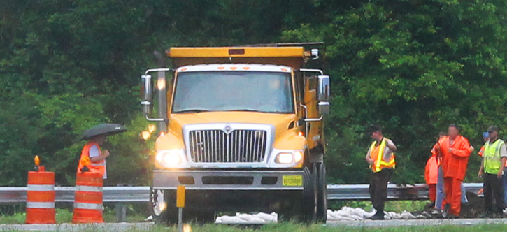 Pictured top: FDOT crews make temporary repairs to a collapsed shoulder on Highway 97 in Walnut Hill Friday morning. Pictured below: Contractor Transfield Services surveys the collapse after it was discovered in mid-May. NorthEscambia.com photos, click to enlarge.