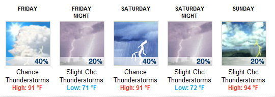 - Saturday A 40 percent chance of showers and thunderstorms. Mostly cloudy, with a high near 91. Light and variable wind becoming south 5 to 10 mph in the morning.