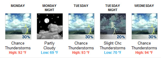 - Wednesday A 30 percent chance of showers and thunderstorms. Mostly sunny, with a high near 94. Calm wind becoming south around 5 mph in the afternoon.