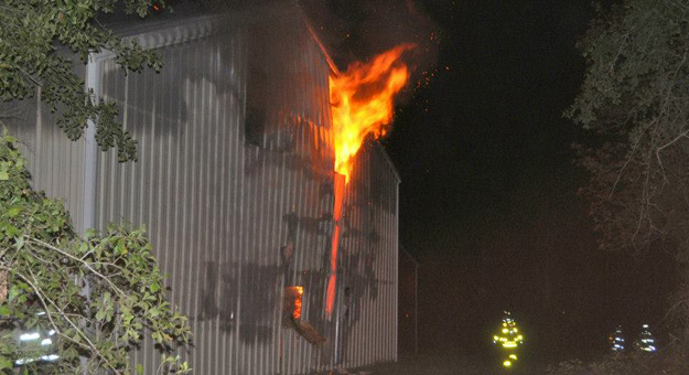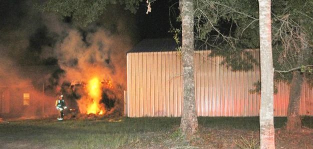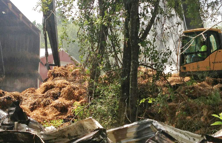 Pictured top and page bottom: Firefighters and county crews with heavy equipment continued to work to fully extinguish hay Tuesday morning in Molino. Photos by Jenise Fernandez, WEAR 3, for NorthEscambia.com. Inset and photos below: Fire burns through a Molino barn Monday night. NorthEscambia.com photos by Kristi Smith, click to enlarge.