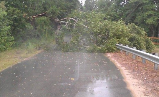 Thunderstorms with gusty winds moved through portions of the North Escambia area this afternoon. In Molino, portion of a tree fell across Fairground Road, and about three dozen Gulf Power customers in the Fairground Road area south of Cedartown Road lost power.