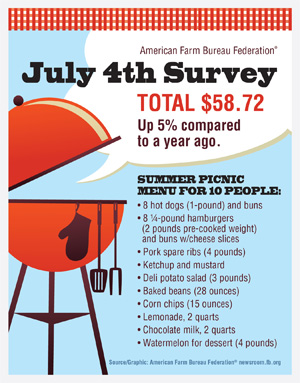 Farm Bureau’s informal survey reveals the average cost for a summer picnic for 10 is $58.72, or $5.87 per person. That’s about a 5-percent increase compared to a year ago.
