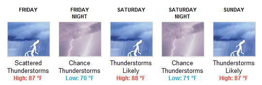 - Friday Scattered showers and thunderstorms. Mostly cloudy, with a high near 88. Calm wind becoming southeast around 5 mph in the afternoon. Chance of precipitation is 50%.
