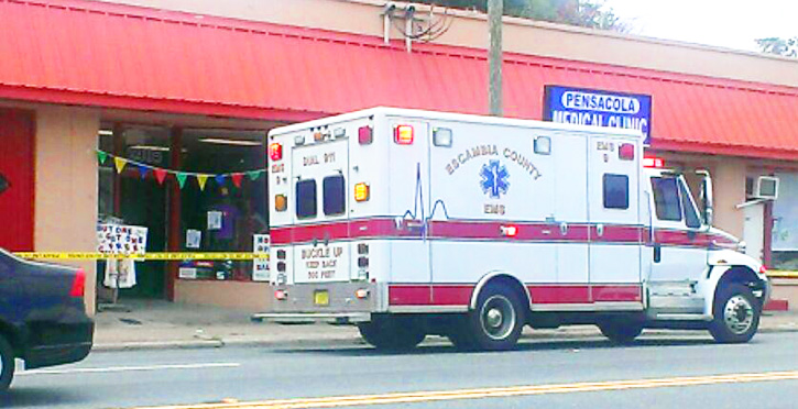 Pictured: A woman was shot and killed inside the business seen to the left of the ambulance Wednesday about noon in Pensacola. Photo courtesy WEAR 3 for NorthEscambia.com, click to enlarge.