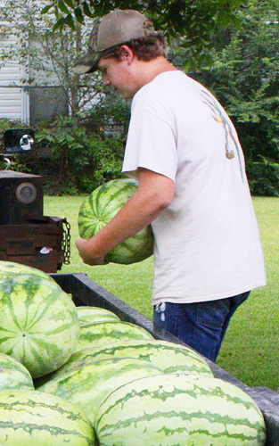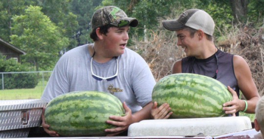 It’s watermelon season, with roadside vendors in Walnut Hill selling fresh melons by the dozens on Friday. Local farmer James Earl Hall’s melons are for sale on Highway 97 at Pine Forest Road (just south of Highway 4) for $6 each. Friday, they were being sold with the help of Maddox Hall, Dawson Brown and Alex Davis (pictured). NorthEscambia.com photos by BethanyReynolds, click to enlarge.